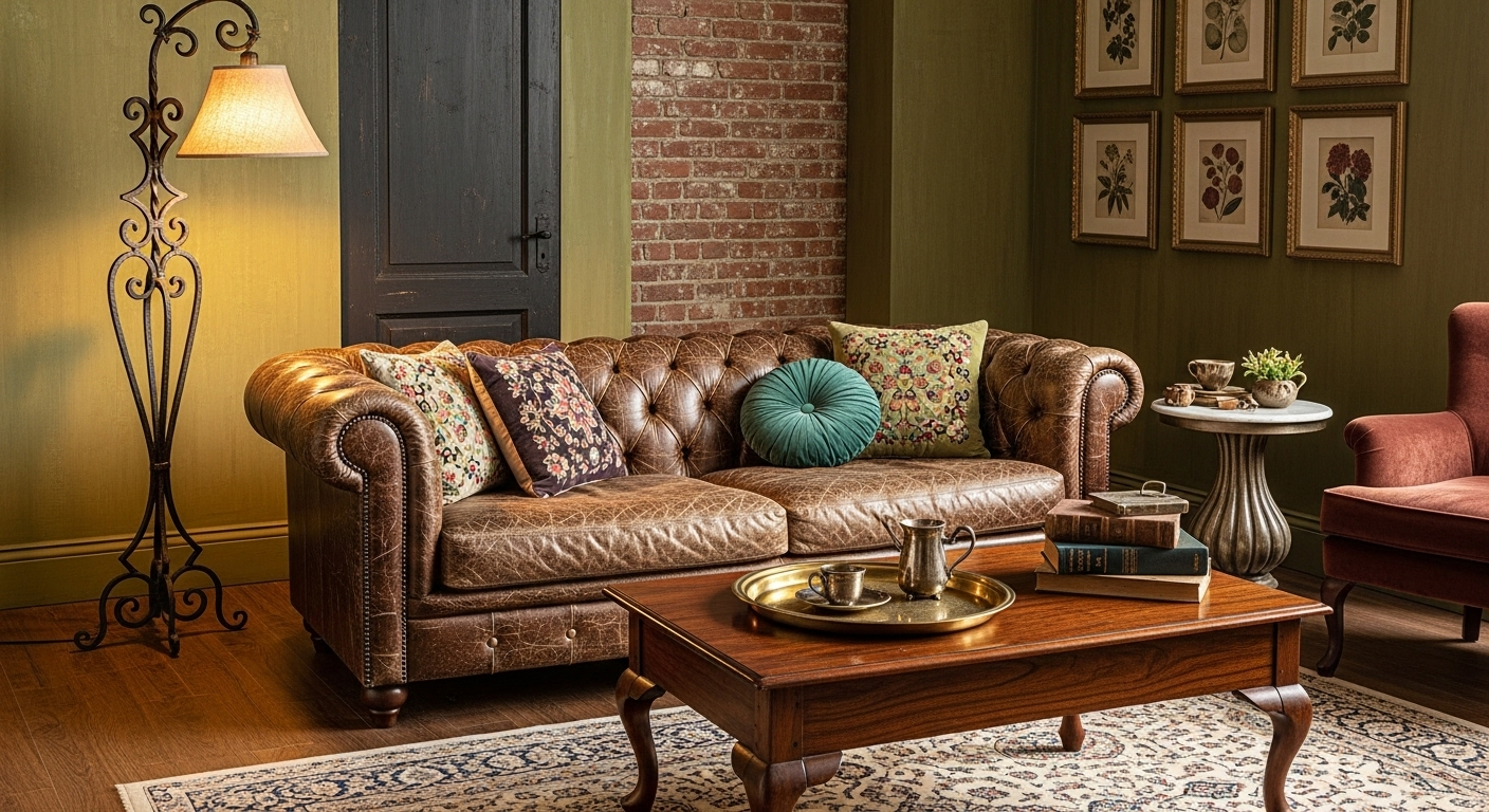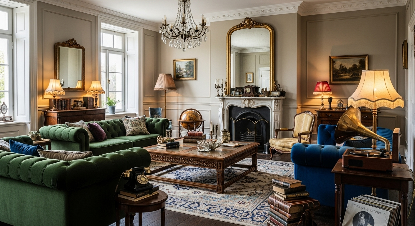 - Phòng khách: Bộ sofa bọc da cũ kỹ hoặc vải hoa văn cổ điển, kết hợp bàn trà gỗ sờn và thảm họa tiết. Trưng bày đồ cổ, sách cũ để biến không gian thành một “bảo tàng mini”. Ánh sáng vàng từ đèn chùm cổ kính hoàn thiện bầu không khí.