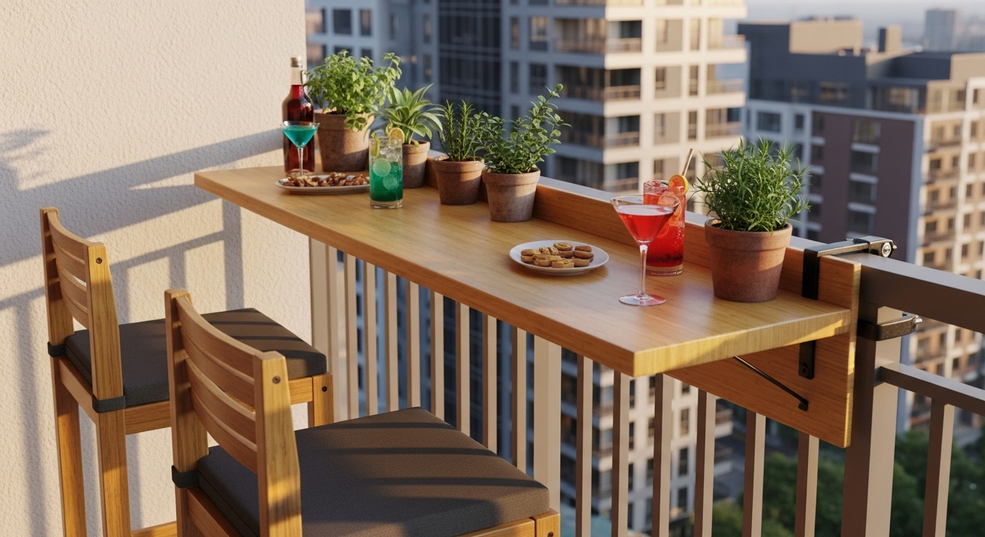 - Thiết kế: Một tấm ván gỗ chống thấm cố định chắc chắn vào lan can, kết hợp với 2-3 chiếc ghế bar gấp gọn.