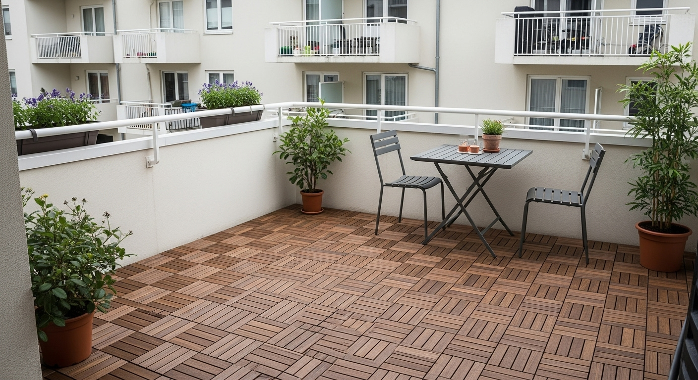 Thay vì gạch men lạnh lẽo, sàn gỗ nhựa (WPC) là vật liệu lý tưởng, ấm áp, chống trơn trượt và dễ lắp đặt. Sàn WPC là một ý tưởng trang trí ban công chung cư bền vững và sang trọng.