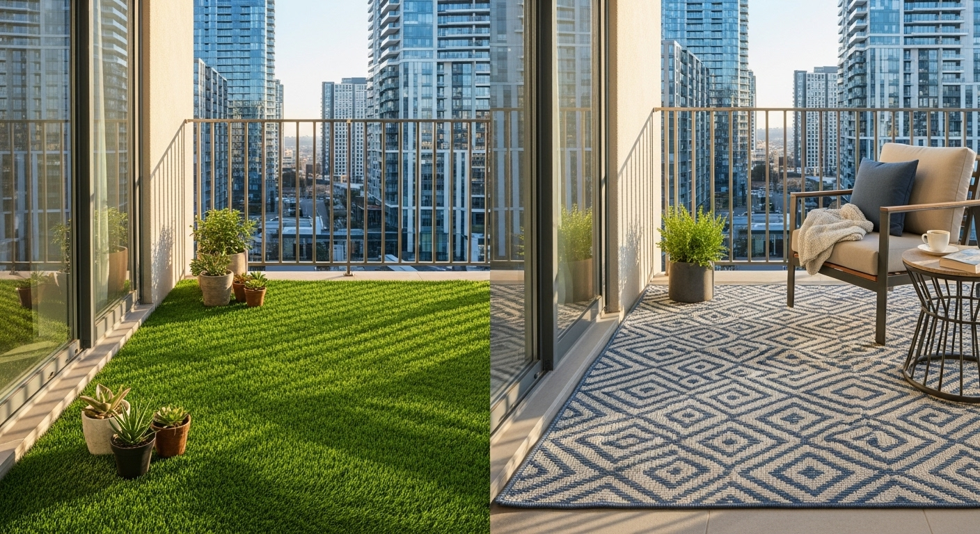 Thảm cỏ nhân tạo giúp tạo cảm giác xanh mướt mà không cần chăm sóc. Kết hợp thảm cỏ với một tấm thảm dệt họa tiết sẽ tăng thêm sự ấm cúng, biến ban công thành một không gian sử dụng đa năng.